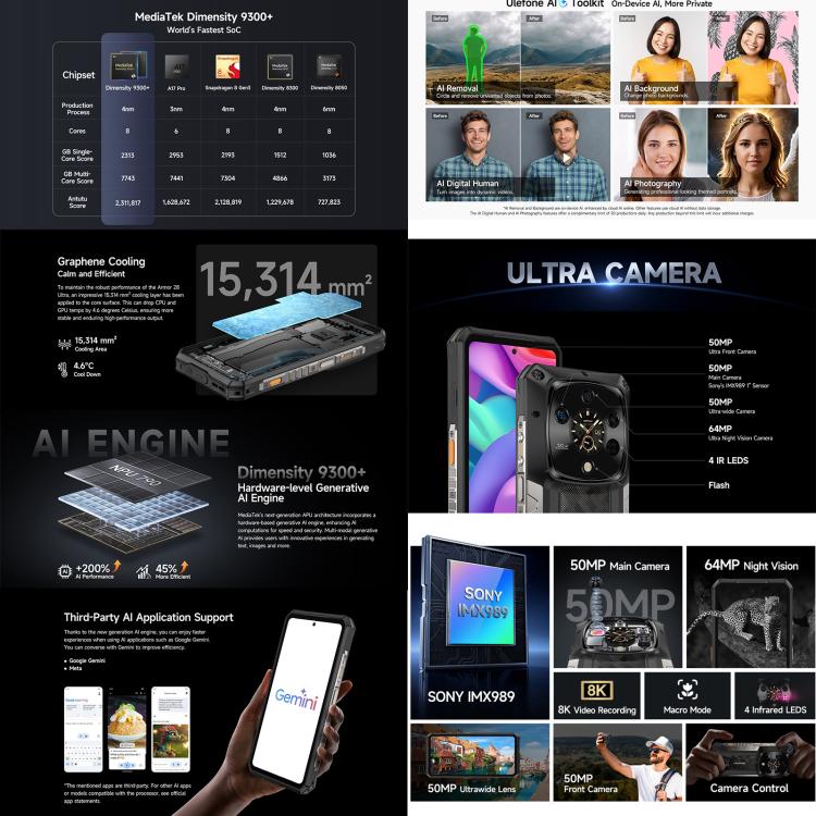 Teléfono ultrarresistente Ulefone Armor 28, 16 GB + 1 TB, visión nocturna, 10600 mAh, pantalla de 6,67 pulgadas, Android 14, MediaTek Dimensity 9300+, procesador de ocho núcleos, conectividad 5G, NFC., Armor 28 Ultra